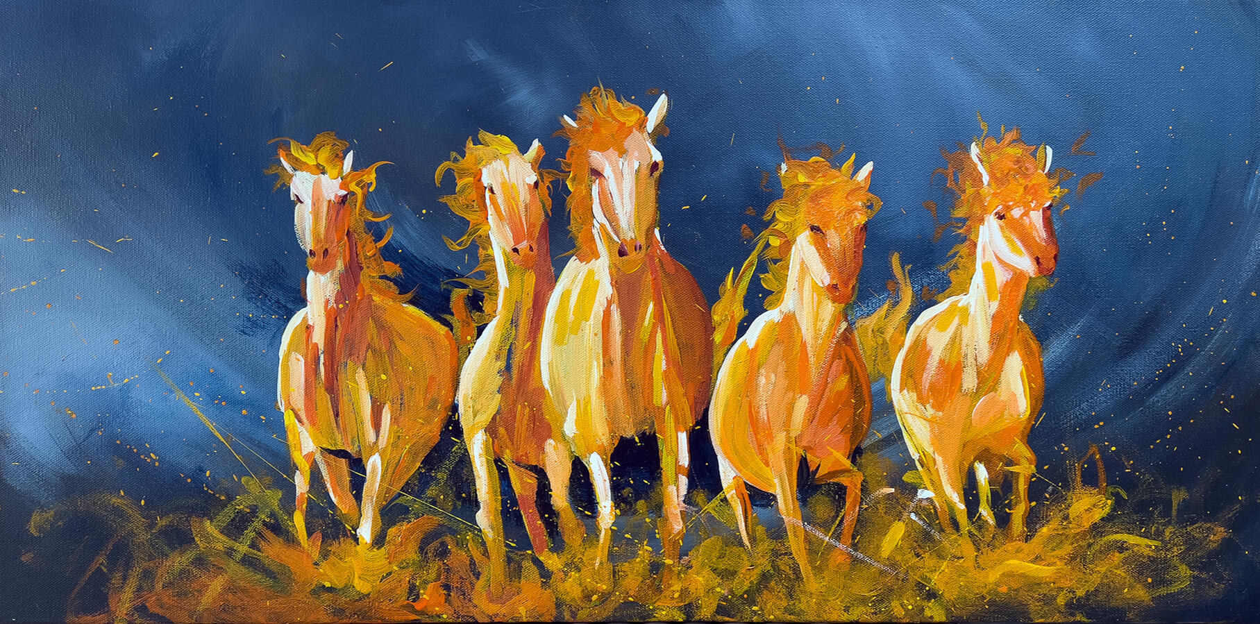 Forge captures the raw moment where energy becomes direction — five horses emerging from darkness, their forms ignited in strokes of flame and motion. They do not retreat. They advance.Strength, momentum, and unified force drive this composition forward, creating a commanding presence that transforms any space it inhabits.The deep backdrop amplifies the fire within each figure, allowing light, movement, and intensity to take center stage. It is a visual statement about progress — the kind built through determination, vision, and relentless forward motion.Designed for modern interiors, executive offices, and bold architectural spaces, Forge brings both refinement and power to the environment. It invites focus, sparks ambition, and serves as a daily reminder that momentum is created — not waited for.Printed as a Studio Canvas Edition, this artwork is reproduced to honor the texture, depth, and dynamic brushwork of the original painting. The result is a striking, museum-quality canvas that holds its presence from across the room.→ Studio Canvas Edition (artist reproduction)