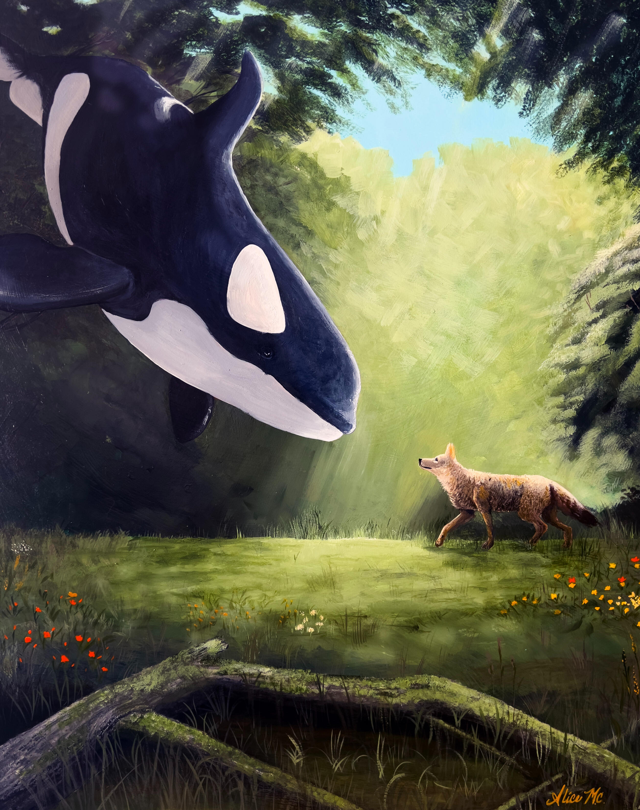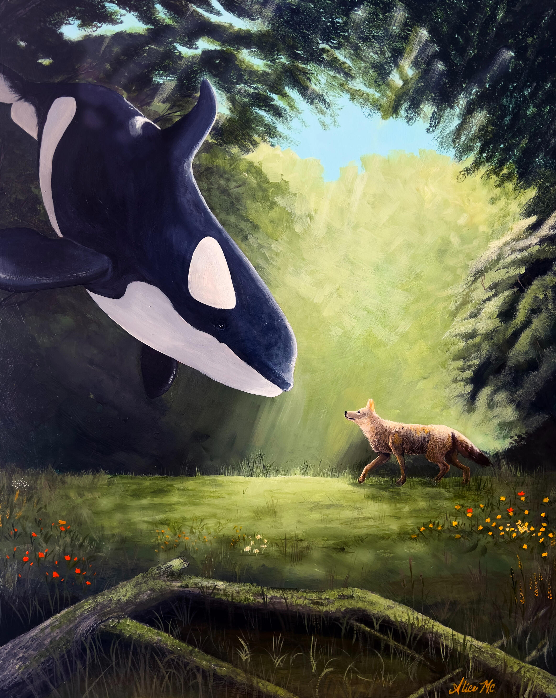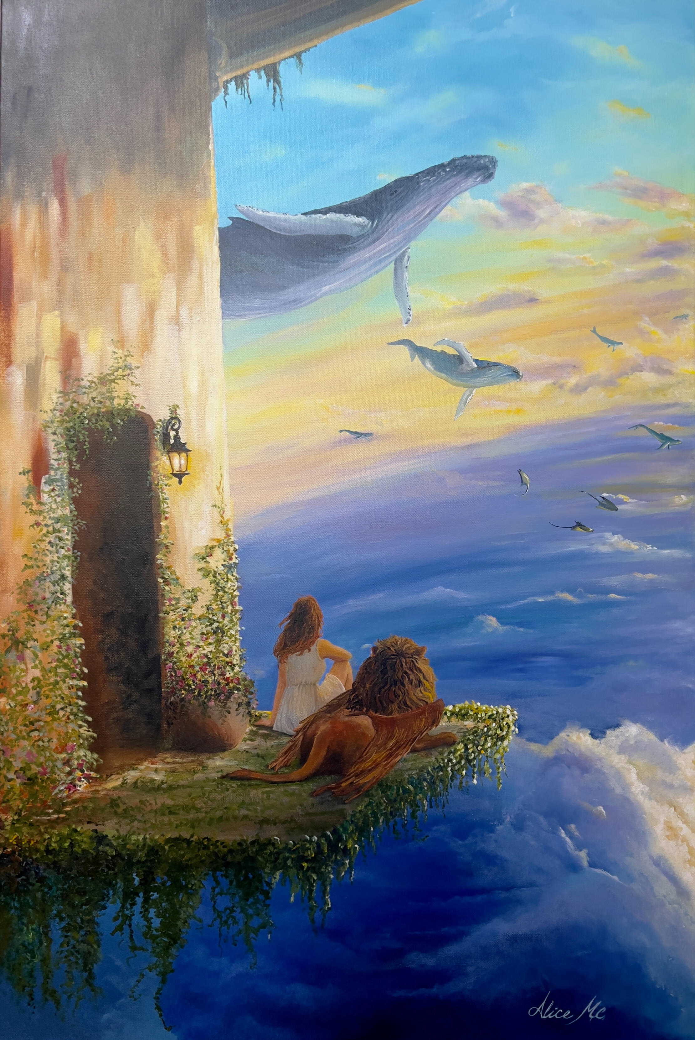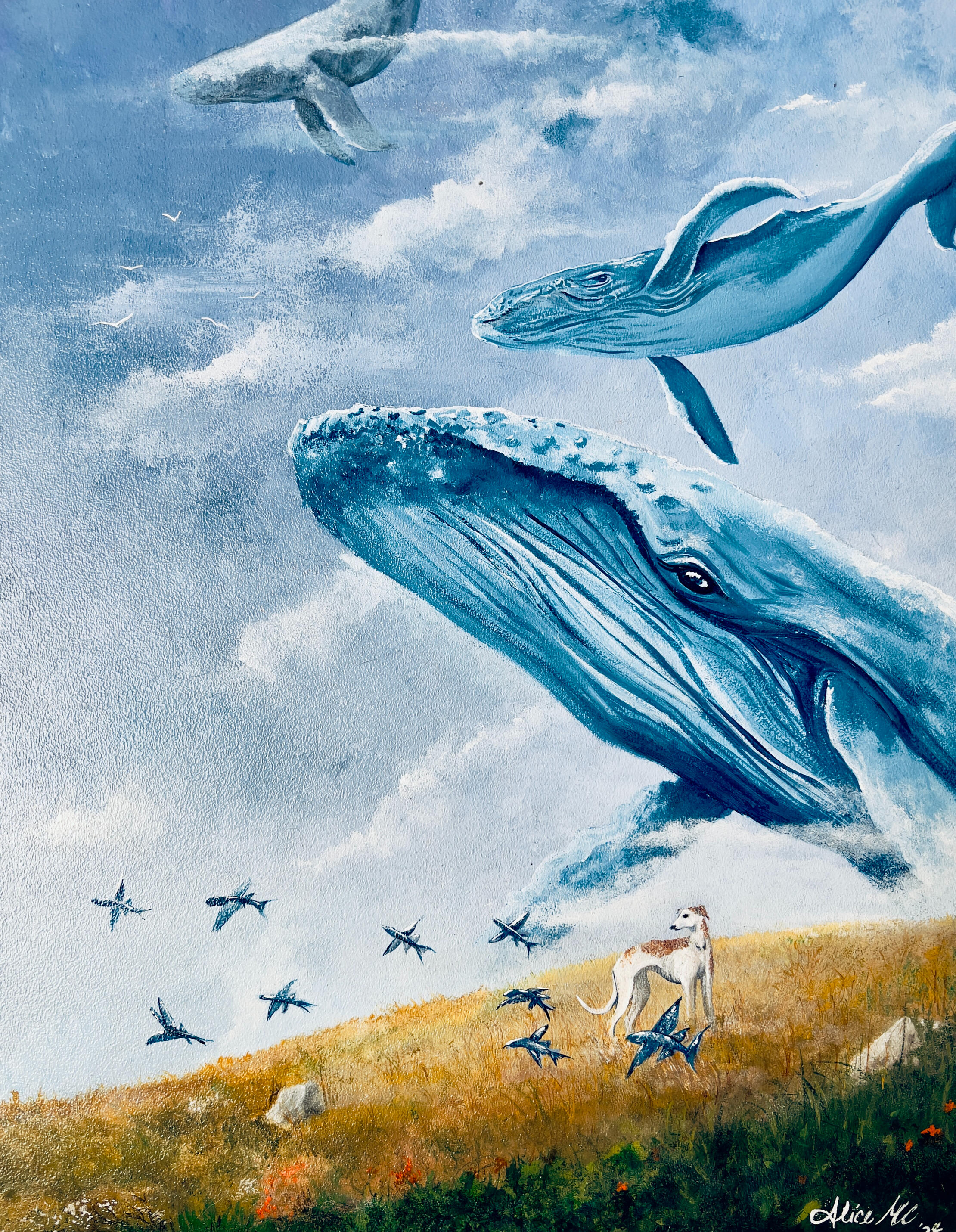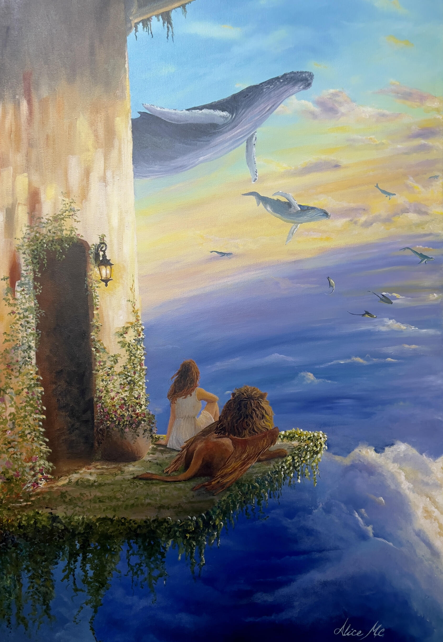 The Dog’s Journey captures a tender moment beneath an open sky, where companionship and imagination meet. A whale glides overhead as birds rise in the distance, creating a dreamlike scene that speaks to hope, guidance, and the bonds that quietly shape our lives.This piece reflects on the journeys we share with those who walk beside us — a gentle reminder that love often moves beyond what we can see, carrying us forward in subtle and meaningful ways.Printed as a Studio Canvas Edition, this artwork is reproduced to preserve the softness, depth, and emotional presence of the original painting. The result is a richly detailed canvas that brings warmth, quiet storytelling, and a sense of peaceful movement into any space.→ Studio Canvas Edition (artist reproduction)